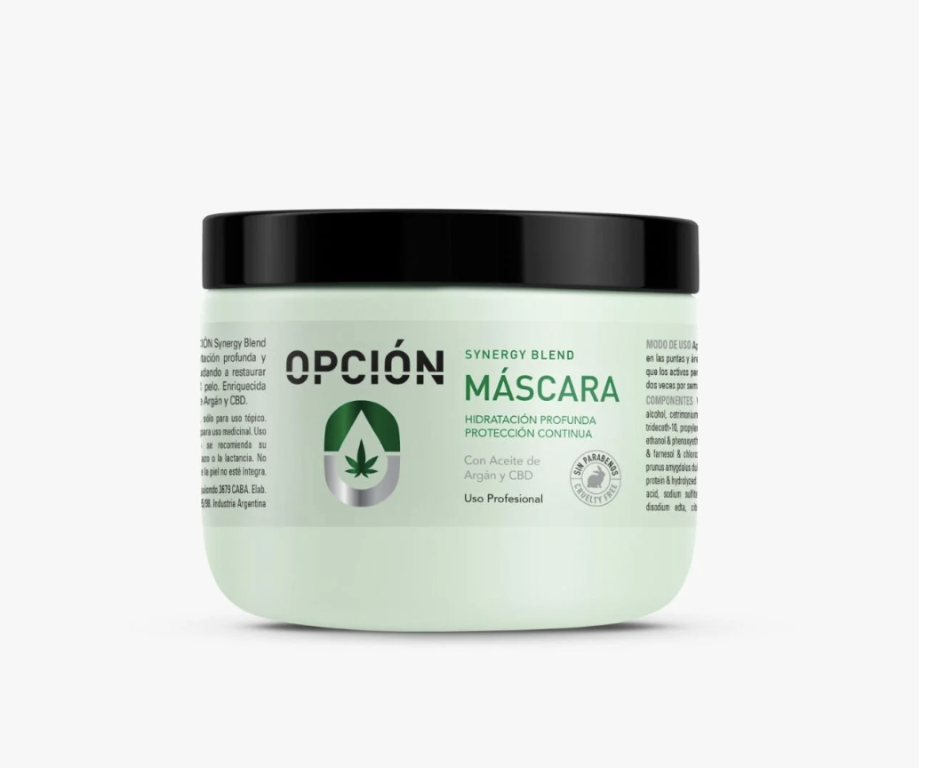 La Máscara Capilar OPCIÓN Synergy Blend proporciona una hidratación profunda y protección intensa, ayudando a restaurar la salud y vitalidad del pelo. Enriquecida con aceites naturales de Argán y CBD.