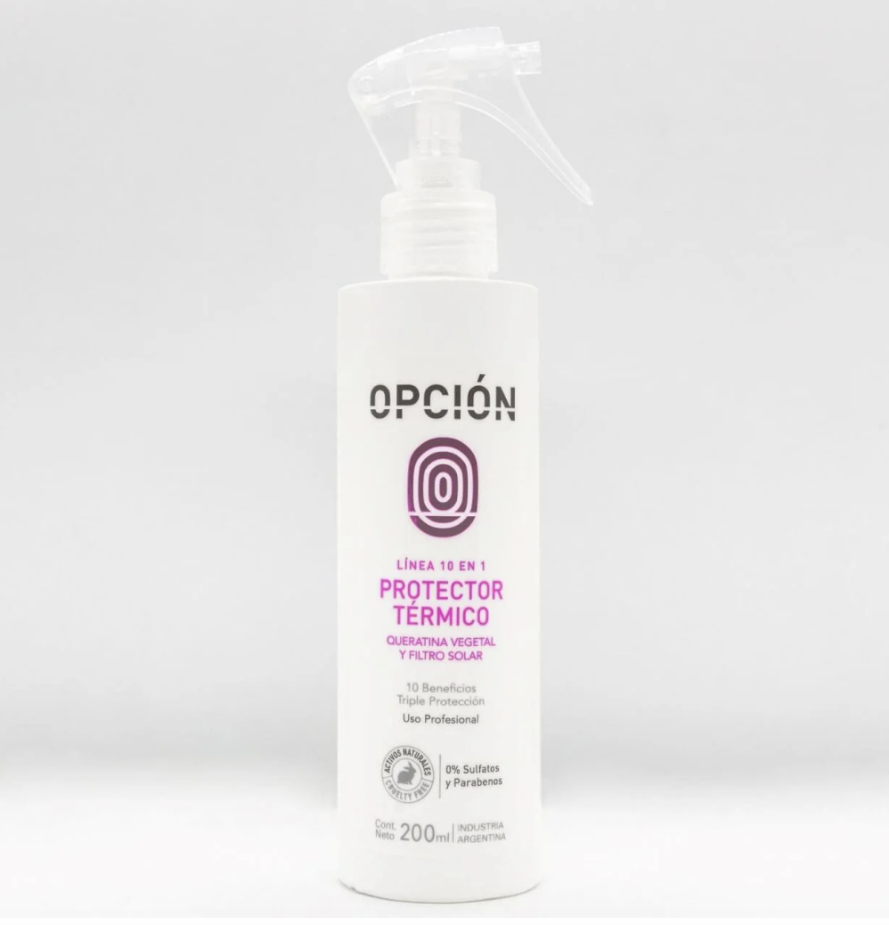 El protector térmico OPCION, enriquecido con queratina vegetal y glicerina, está formulado para tratar todos los tipos y necesidades del cabello, con tecnología 3X Protection System, preserva al cabello del color, calor y sol, ya que contiene filtro solar.