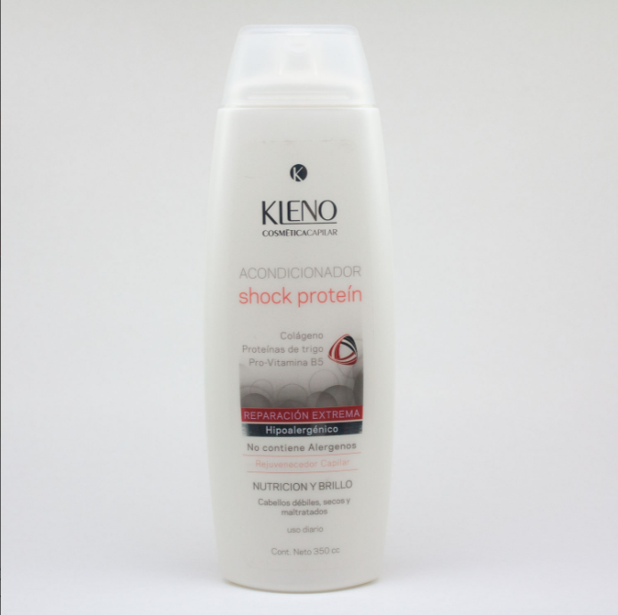 Acondicionador Shock Protein Kleno está especialmente formulado para cabellos débiles, secos y maltratados, fortaleciéndolo y devolviéndole su juventud. La acción del Colágeno y las proteínas de trigo repara la fibra capilar dañada, aportándole nutrición y recuperando su brillo natural. El aporte de Pro-vitamina B5, componente natural del cabello sano, protege, recupera y repara el cabello, creando una película protectora que lo mantiene hidratado por más tiempo. Al no contener alérgenos, es apto para usar sobre cueros cabelludos sensibles e irritados. Para obtener un mejor resultado aplicar luego del lavado con Shampoo Shock Protein.