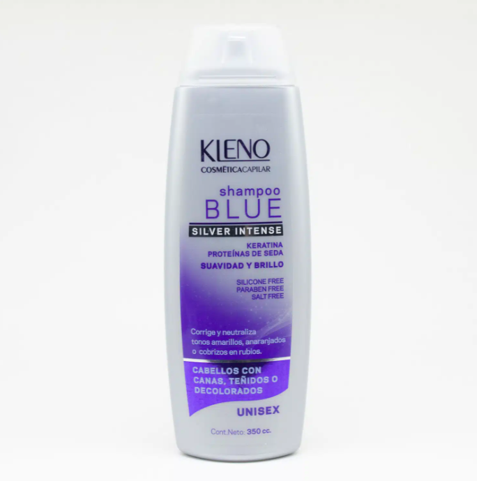 BLUE SHAMPOO KLENO está especialmente formulado para neutralizar y corregir los indeseables tonos amarillos, anaranjados o cobrizos no deseados que aparecen en los cabellos tratados con coloración o cabellos con canas, aportando sobre estos últimos un tono plata intenso