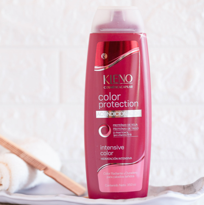 Acondicionador Color Protection KLENO, posee una formulación concentrada en nutrien- tes y Pro-Vitaminas que otorgan suavidad y fortalecimiento a los cabellos, reparando el daño causado por los ingredientes químicos y colorantes; creando además una capa protectora para sellar la hidratación, el brillo y el color. PROTEÍNA DE SOJA De origen vegetal, es una proteína de alto peso molecular que absorbe humedad, formando un film superficial e impidiendo la deshidratación de la fibra capilar. Debido a su propiedad Antioxidante reduce el envejecimiento del color. PROTEINAS DE TRIGO Sella el color evitando la acción de arrastre del agua. Son altamente sustantivas y capaces de penetrar en la cor- teza, para una acción más profunda. Retienen la humedad, aportan flexibilidad y dan cuerpo al cabello, mejorando su textura y suavidad. D-PANTENOL Acondiciona sin eliminar el color y al mismo tiempo re-equilibra la estructura del pelo teñido, otorgando fortaleza, brillo y elasticidad, facilitando el peinado.