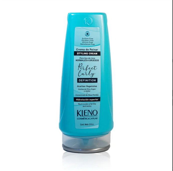 Aceites de Oliva, Argan y Jojoba + Concentrado de Oleos Florales. Perfect Curly Definition KLENO es una crema para rizos que fortifica el cabello aportando una definición duradera de los rulos. Otorga un cuidado inten- sivo, nutriendo en profundidad y regenerando la fibra capilar, aportándole una hidratación superior. Reduce el frizz y otorga un brillo extremo, logrando como resultado una definición duradera de los rulos. Regenera la fibra capilar, previene la rotura del cabello y evita las puntas abiertas y proporciona una protección térmica hasta 80°C.